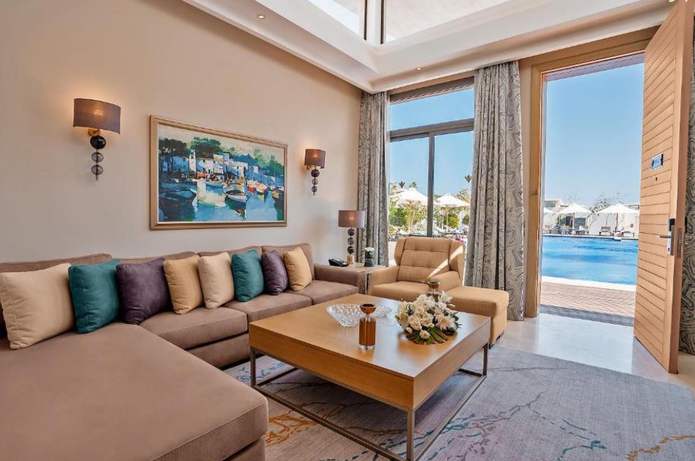 Todas las suites y villas tienen vistas panorámicas al jardín, a la piscina y al mar. TV de pantalla plana, caja fuerte, minibar (reposición diaria), cafetera espresso, carta de almohadas y artículos de aseo.