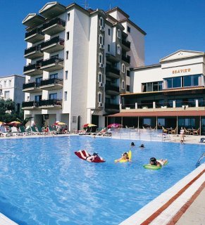 Este complejo, renovado en 2005, tiene 7 plantas en las que se reparten un total de 52 suites. Tiene a su disposicin vestbulo con recepcin 24 horas, caja fuerte, servicio de cambio de divisa y ascensor. Adems, el edificio climatizado alberga minimercado, discoteca, sala de juegos, sala de TV y conexin a Internet (con cargo extra). En el aspecto gastronmico cuenta con cafetera, 3 bares y 2 restaurantes. Los pequeos pueden jugar en el parque infantil. Desde la terraza del restaurante hay unas vistas maravillosas del mar, tpicas de una postal. Tambin se ofrece aparcamiento y con cargo extra, servicio de habitaciones.