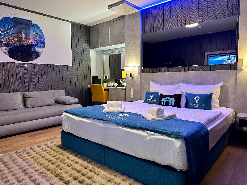Bienvenido a Smart Hotel, el exclusivo showroom de la bodega Juhasz Brothers en Budapest. Ubicado en el centro de la ciudad, a pocos pasos de la animada calle Kiraly, nuestro hotel ofrece fácil acceso al barrio de los museos de Budapest, incluyendo la Plaza de los Héroes, el Zoo de Budapest y el Jardín Botánico, y los Baños Termales Széchenyi. Disfruta de una estancia tranquila y relajante, perfecta para familias, viajeros de negocios y turistas por igual. Deléitate con catas de vinos húngaros tradicionales y experimenta la innovadora tecnología inteligente. Personaliza tu habitación, confortablemente amueblada, con solo dos clics en la tablet de la habitación o en tu propio dispositivo móvil. Relájate en nuestro centro Smart Wellness y descubre nuestra exclusiva selección de vinos, que incluye los mundialmente famosos vinos Juhasz Brothers y el Egri Bikavér, uno de los mejores vinos tintos de Hungría.