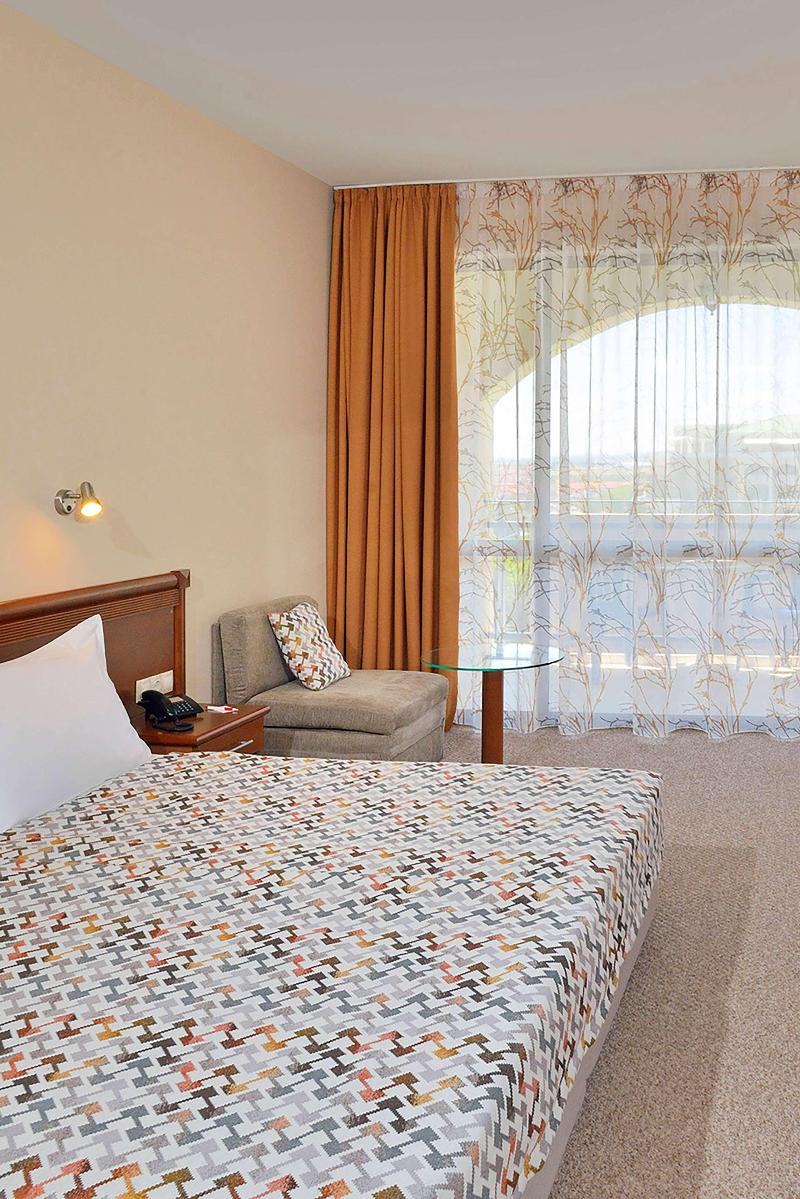 Ubicado en un exuberante parque y jardines junto a una playa de arena, el tranquilo Sol Nessebar Resort promete unas vacaciones familiares inolvidables. Este complejo turístico cuenta con tres hoteles: el Sol Nessebar Bay y el Sol Nessebar Mare de 4 estrellas, y el Sol Nessebar Palace de 5 estrellas. Te esperan un total de 992 amplias habitaciones dobles y familiares recientemente renovadas, cada una decorada con buen gusto y equipada para una estancia cómoda. Las habitaciones dobles cuentan con dos camas individuales y un sofá cama, mientras que las habitaciones familiares ofrecen dos dormitorios interconectados para mayor privacidad. La mayoría de las habitaciones disponen de balcones privados con magníficas vistas al mar, y también hay habitaciones accesibles disponibles. Se ofrece wifi gratuito en todo el complejo. Podrás disfrutar de un emocionante parque acuático con cinco toboganes y un río lento, una zona acuática infantil con un parque de chapoteo, dos piscinas y toboganes, y un club infantil para niños de 4 a 12 años. Un vibrante programa de entretenimiento para todas las edades incluye actividades diurnas, espectáculos nocturnos y un gran escenario al aire libre. Los restaurantes principales del complejo ofrecen bufés internacionales para el desayuno, el almuerzo y la cena, con cocina en vivo y noches temáticas. Los tres restaurantes han sido completamente renovados para el verano de 2023. Relájate en las terrazas junto a la playa con sombrillas, tumbonas y un bar de playa con todo incluido.