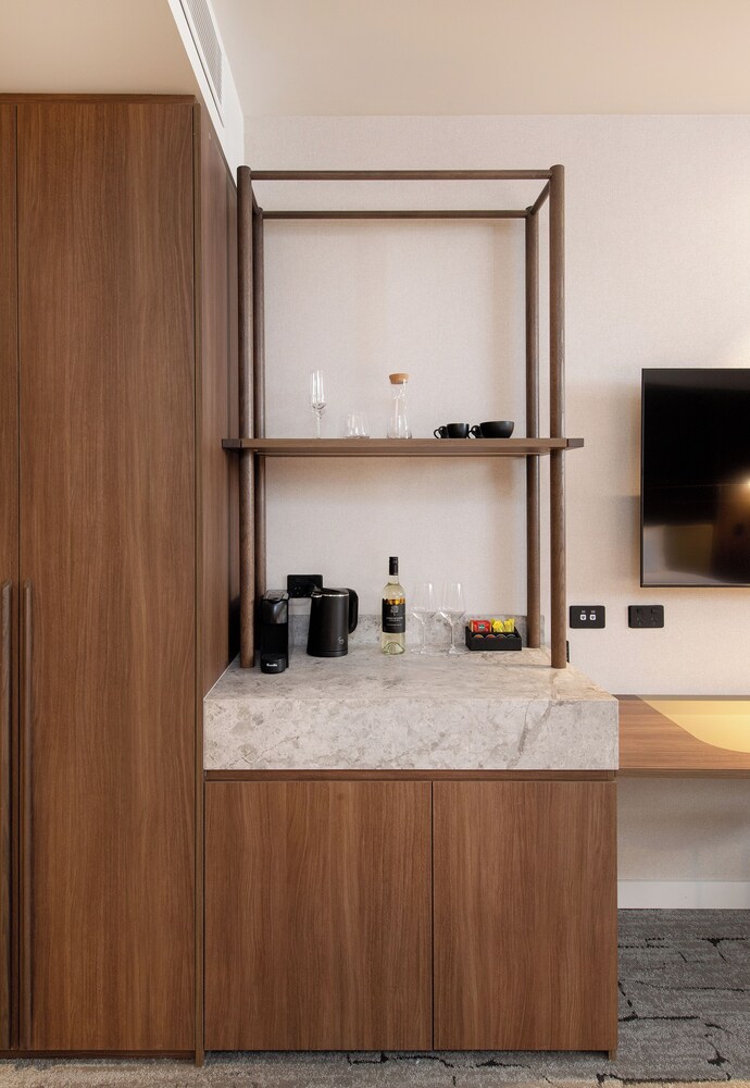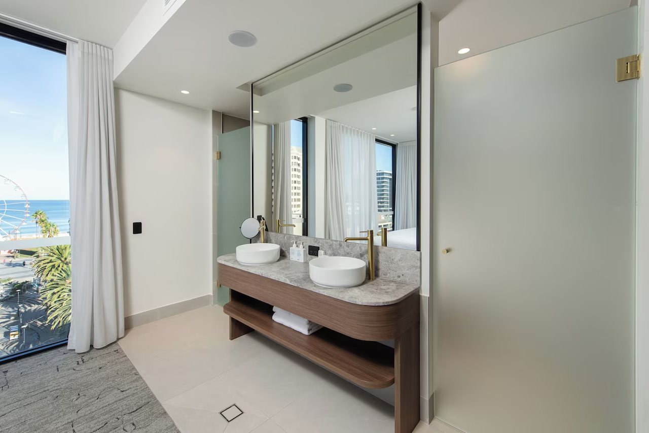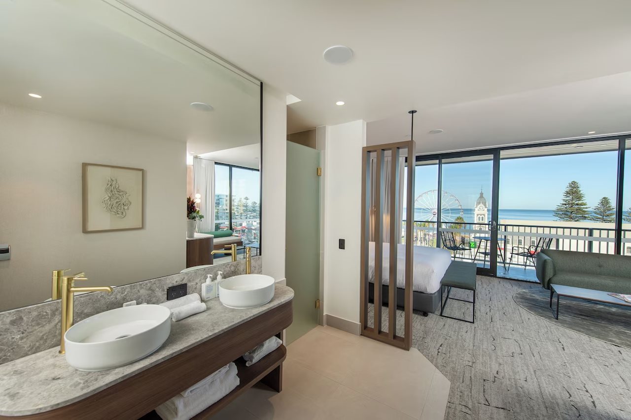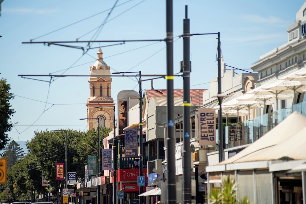 The George ligger i hjertet av Glenelg, bare noen øyeblikk fra sand y og sjø, og tilbyr en stillig y avslappet kystopplevelse i et av Adelaides mest ikoniske strandområder. El hotel está a 20 minutos de Adelaide CBD y a 10 minutos de Flyplaces, y es la base perfecta para una playa, un spa de vacaciones en la playa y para las noches de Glenelgs una cafetería, un restaurante y una boutique de compras.