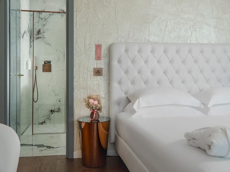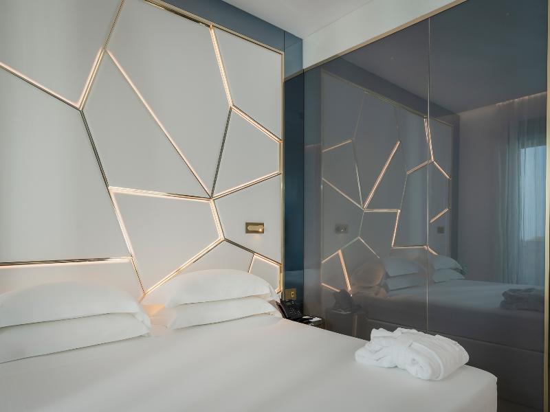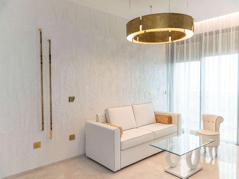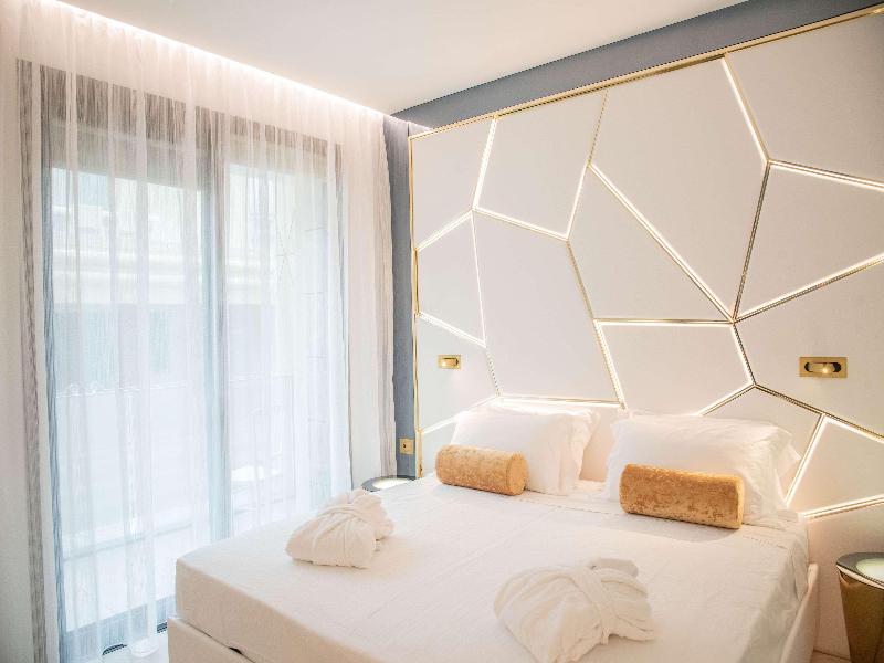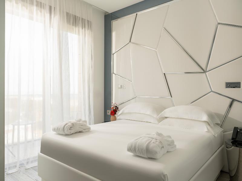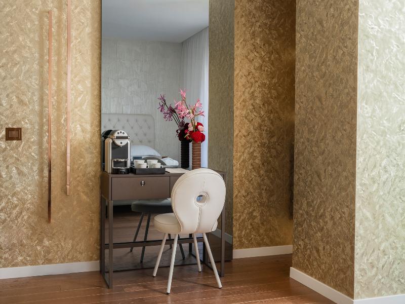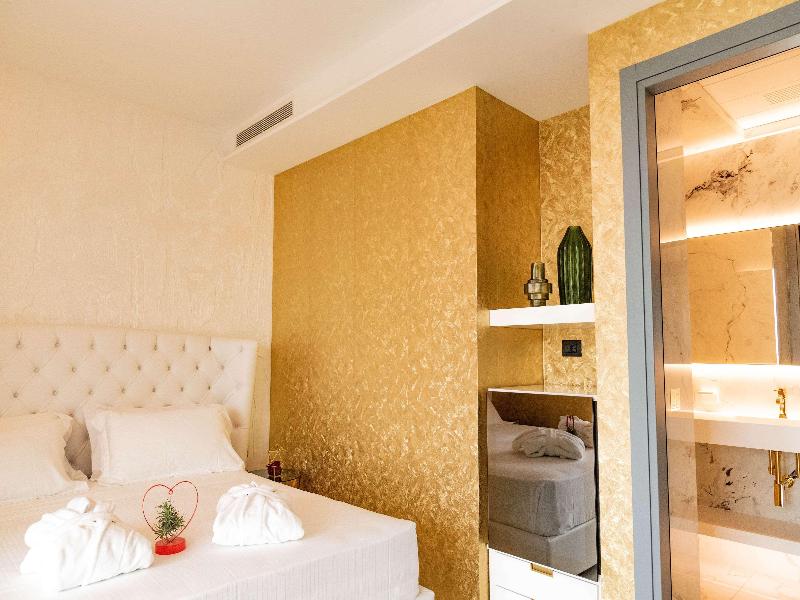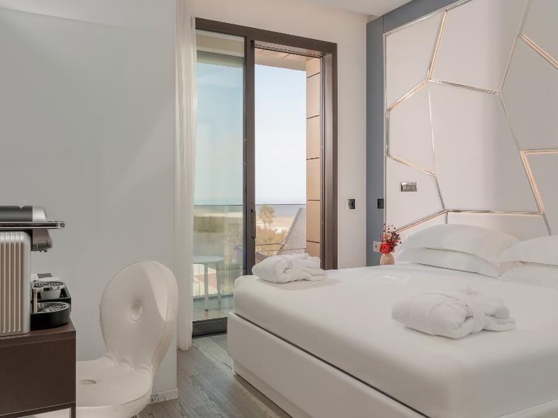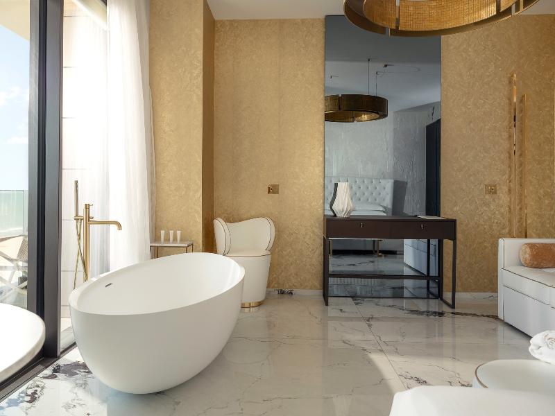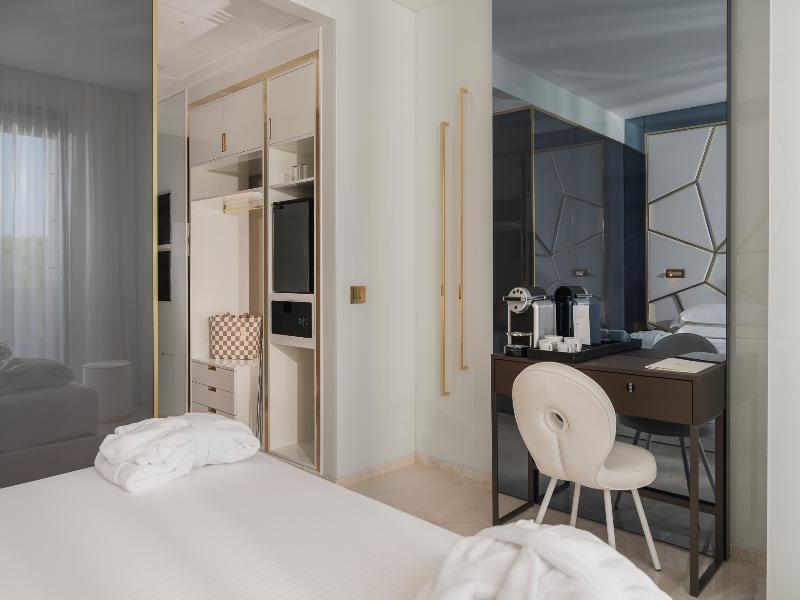 El Promenade Luxury Wellness Hotel es una joya de la hostelería de lujo, como el oro que lo caracteriza, leitmotiv de su arquitectura y diseño interior. Este espléndido hotel de 5 estrellas en el corazón de Riccione, con vistas al mar, ofrece habitaciones y suites elegantemente amuebladas y diseñadas para ofrecer el máximo confort. La modernísima estructura, de reducido impacto ambiental, se distribuye en ocho plantas comunicadas por ascensores, en un ambiente exclusivo y con un extraordinario equipamiento de bienestar. El hotel cuenta con una vanguardista sala de fitness panorámica de Technogym; un suntuoso spa donde puedes disfrutar del circuito húmedo con piscina climatizada con hidromasaje y los tratamientos más innovadores de la cosmética de alta gama Codage Paris, además de una piscina exterior con zona solárium. En la azotea se encuentra otra piscina infinita con vistas al mar y una suntuosa zona lounge con cócteles y sushi bar. La oferta gastronómica continúa en la sexta planta, con un restaurante gourmet panorámico con especialidades de marisco y una rica bodega con los mejores vinos italianos e internacionales. En la planta baja se encuentra el refinado bistró con terraza exterior, abierto desde la mañana hasta la noche para desayunos, almuerzos rápidos y aperitivos. En la primera planta, el hotel dispone de una sala de reuniones para pequeños eventos de hasta 35 personas, equipada con la tecnología audiovisual más avanzada. El verdadero lujo está en los detalles, empezando por las habitaciones, decoradas con detalles en oro o plata, suelos de parqué o gres porcelánico y amplios ventanales con vistas al mar. Todas climatizadas, con un diseño personalizado y equipadas con modernas tecnologías, las habitaciones disponen de baño privado con albornoces y zapatillas, TV LED de 50 pulgadas, caja fuerte para ordenador portátil, minibar o bodega.
