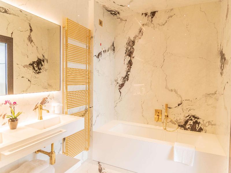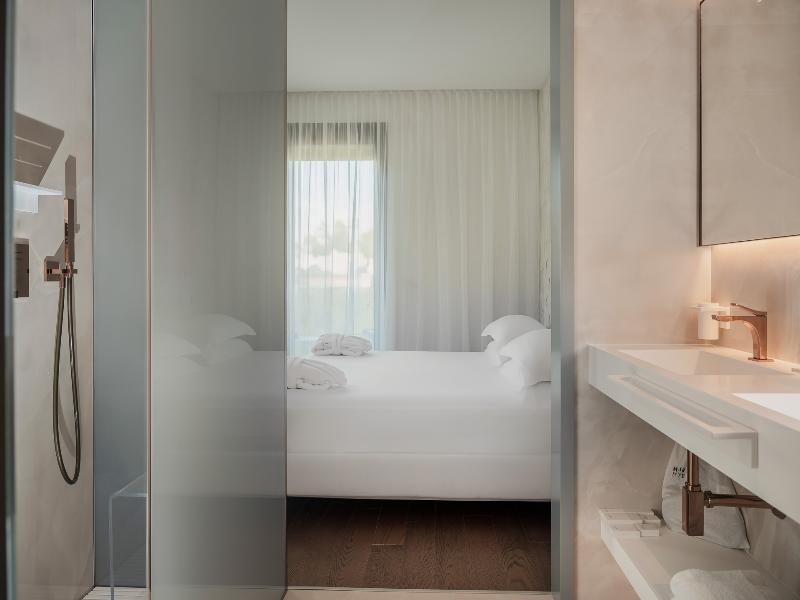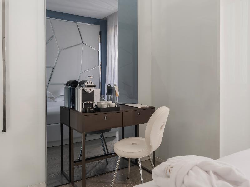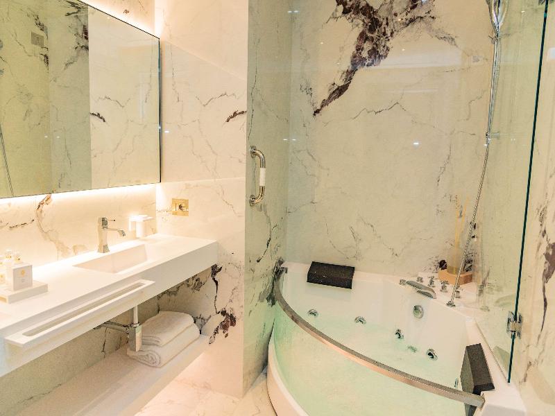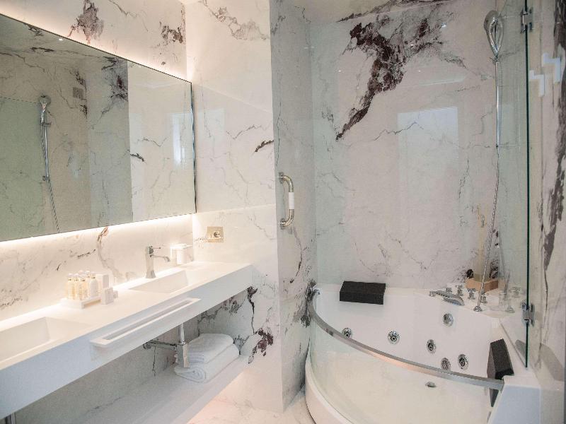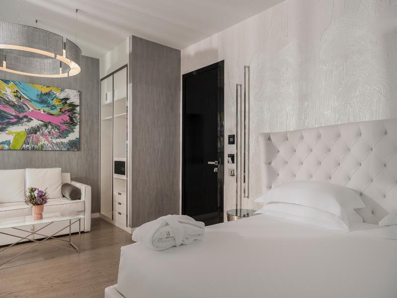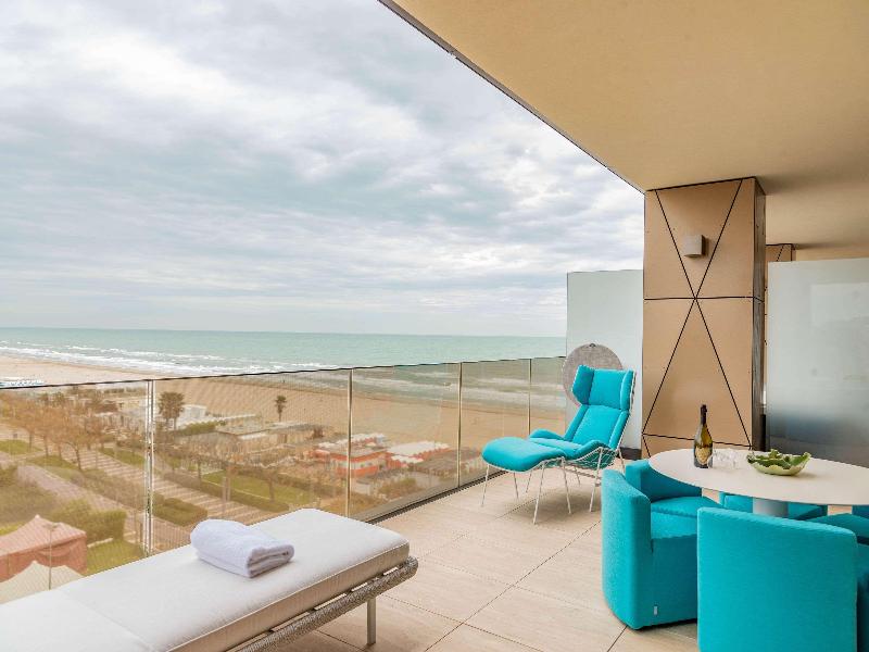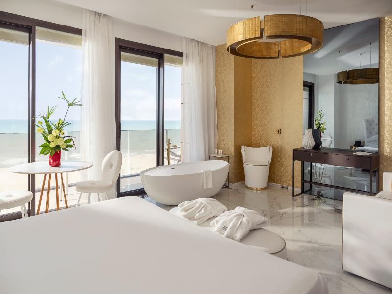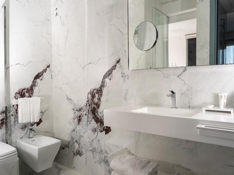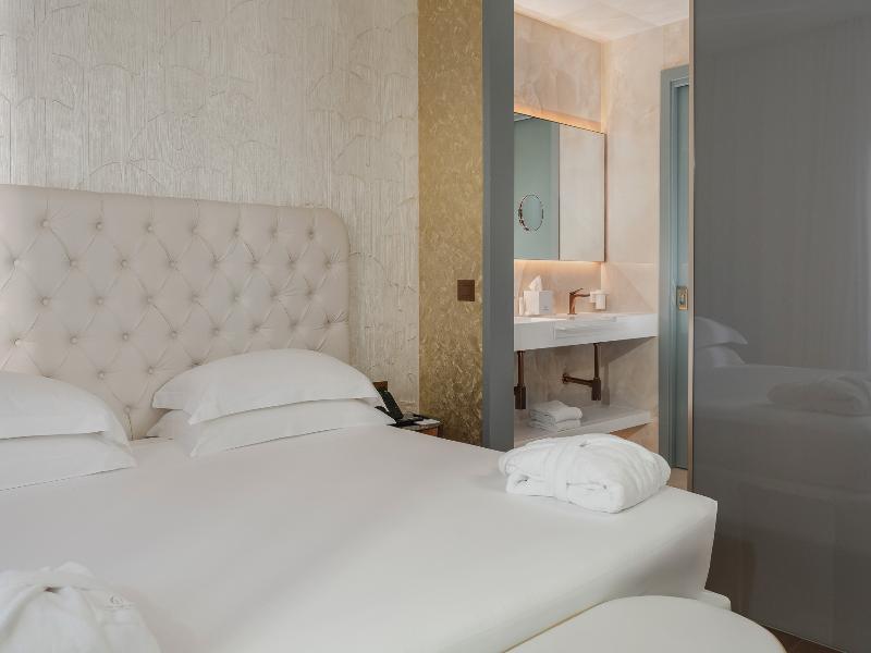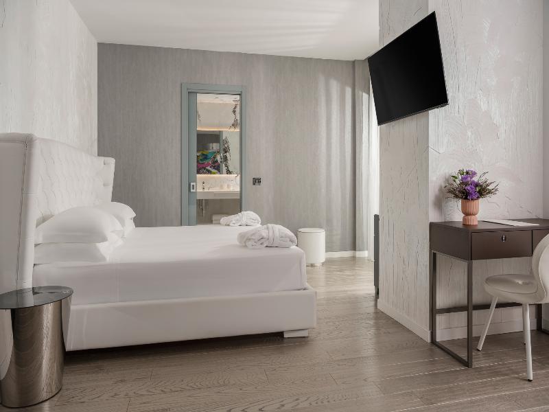 El Promenade Luxury Wellness Hotel es una joya de la hostelería de lujo, como el oro que lo caracteriza, leitmotiv de su arquitectura y diseño interior. Este espléndido hotel de 5 estrellas en el corazón de Riccione, con vistas al mar, ofrece habitaciones y suites elegantemente amuebladas y diseñadas para ofrecer el máximo confort. La modernísima estructura, de reducido impacto ambiental, se distribuye en ocho plantas comunicadas por ascensores, en un ambiente exclusivo y con un extraordinario equipamiento de bienestar. El hotel cuenta con una vanguardista sala de fitness panorámica de Technogym; un suntuoso spa donde puedes disfrutar del circuito húmedo con piscina climatizada con hidromasaje y los tratamientos más innovadores de la cosmética de alta gama Codage Paris, además de una piscina exterior con zona solárium. En la azotea se encuentra otra piscina infinita con vistas al mar y una suntuosa zona lounge con cócteles y sushi bar. La oferta gastronómica continúa en la sexta planta, con un restaurante gourmet panorámico con especialidades de marisco y una rica bodega con los mejores vinos italianos e internacionales. En la planta baja se encuentra el refinado bistró con terraza exterior, abierto desde la mañana hasta la noche para desayunos, almuerzos rápidos y aperitivos. En la primera planta, el hotel dispone de una sala de reuniones para pequeños eventos de hasta 35 personas, equipada con la tecnología audiovisual más avanzada. El verdadero lujo está en los detalles, empezando por las habitaciones, decoradas con detalles en oro o plata, suelos de parqué o gres porcelánico y amplios ventanales con vistas al mar. Todas climatizadas, con un diseño personalizado y equipadas con modernas tecnologías, las habitaciones disponen de baño privado con albornoces y zapatillas, TV LED de 50 pulgadas, caja fuerte para ordenador portátil, minibar o bodega.