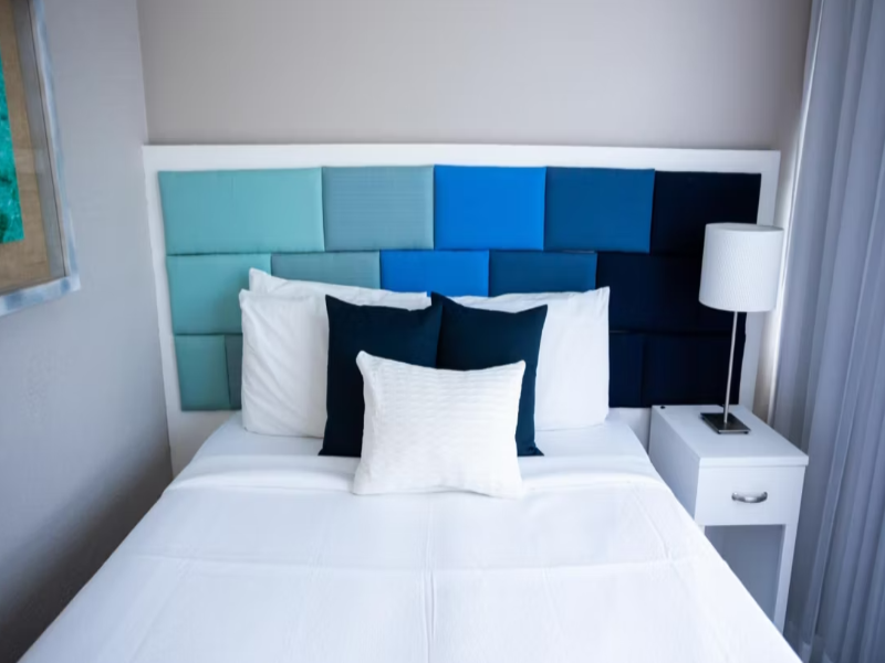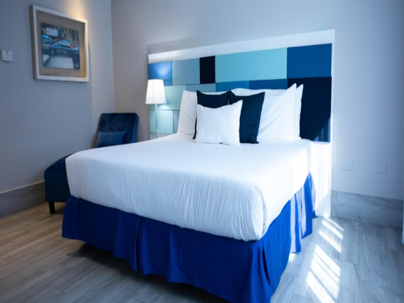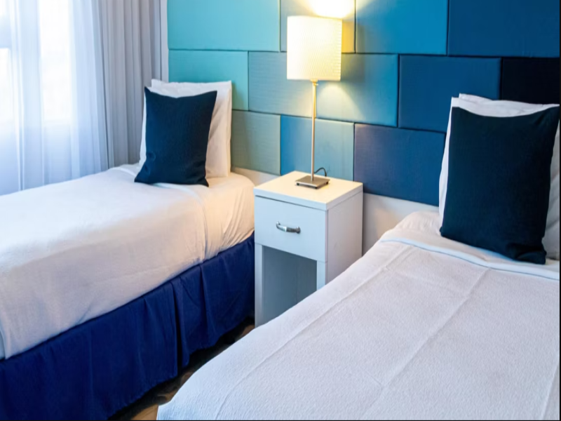 Para comenzar nos dieron dos camas twin y éramos dos adultos pareja. Tuvimos que mover las camas nosotros mismos para poder unirlas. Habían unos almohadones decorativos azules, que apestaban a sudor...