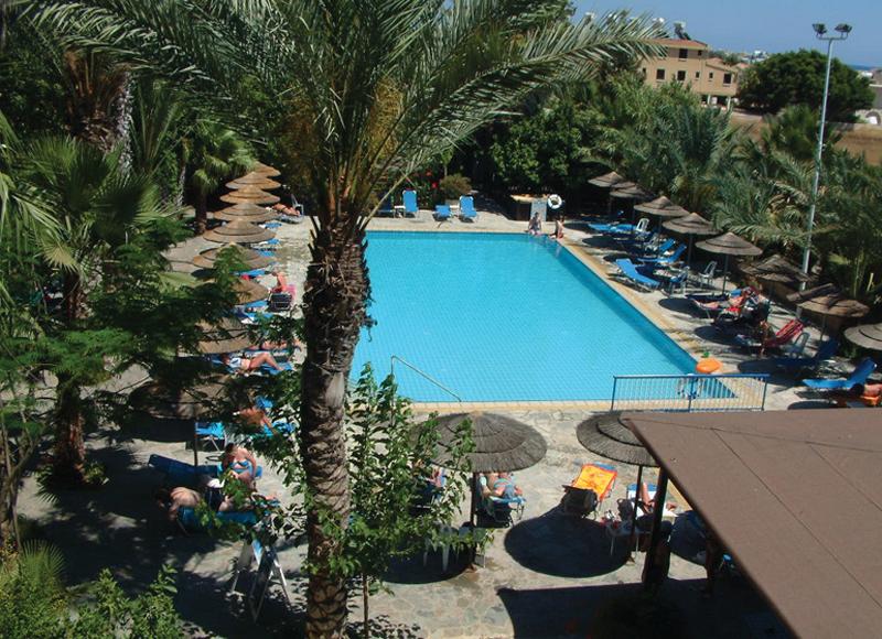 Ubicación - El hotel se encuentra en la zona turística de Paphos, en una preciosa zona ajardinada y a unos 500 metros de la playa de Kies. El centro de Paphos, con su pintoresco puerto, está situado a 4 kilómetros del hotel. Se puede llegar muy fácilmente y en pocos minutos con el autobús de línea, cuya parada está enfrente del complejo (a 100 metros). Pero también encontrará tiendas, comercios y diversos lugares de ocio en el centro de esta zona turística. En 30 minutos puede llegar al aeropuerto (15 kilómetros).. Instalaciones - El hotel fue edificado en el año 1985. Los huéspedes se sentirán como en su casa en una de las 115 habitaciones. En el alojamiento los huéspedes son recibidos en el vestíbulo con servicio de recepción las 24 horas y servicio de registro y salida las 24 horas. Hay ascensores para el acceso a la mayoría de las plantas. Las instalaciones incluyen una caja fuerte y una oficina de cambio. La conexión Wi-Fi en las zonas públicas permite a los viajeros mantenerse en contacto con el mundo exterior. En cuanto a opciones gastronómicas, el establecimiento cuenta con un restaurante, una cafetería y un bar. Es posible comprar souvenirs en la tienda de recuerdos. Además, hay un jardín. Las instalaciones del hotel incluyen una sala de TV. Aquellos que viajen con vehículo propio pueden dejarlo en el aparcamiento del alojamiento. La oferta disponible incluye un servicio de canguro, servicio de habitaciones, una lavandería y una peluquería.. Habitaciones - En las habitaciones hay aire acondicionado, calefacción central y un cuarto de baño. El equipamiento básico de la mayoría de las habitaciones incluye un balcón. Además, hay una caja fuerte. Para disfrutar de una estancia agradable, también se ofrecen una nevera y una mini nevera. El equipamiento se completa con un teléfono, un televisor y una radio. El cuarto de baño cuenta con una ducha. Además, hay un secador de pelo.. Deporte y ocio - El establecimiento dispone de una piscina al aire libre y una piscina infantil. También hay una terraza disponible, así como tumbonas y sombrillas. También hay un bar de piscina. En la zona de ocio, el hotel ofrece tenis, gimnasio y solárium, así como, por un cargo extra, billar y sauna. Copyright GIATA 2004 - 2016. Multilingual. Comidas - Se pueden reservar diversos servicios gastronómicos. Los huéspedes pueden escoger entre alojamiento con desayuno, media pensión, pensión completa y todo incluido. Se prepara desayuno, almuerzo y cena. Se sirven bebidas sin alcohol y bebidas alcohólicas.. Tarjetas de crédito - En el alojamiento se aceptan las siguientes tarjetas de crédito: American Express, Visa y MasterCard..
