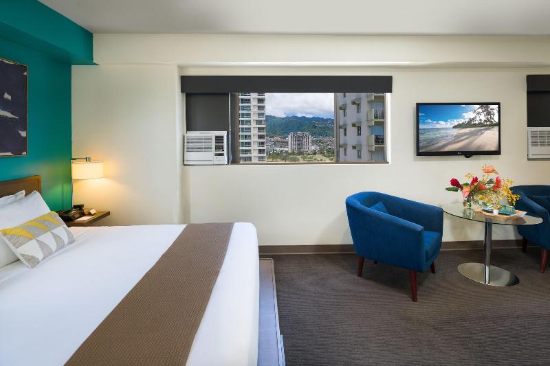 A solo dos manzanas de la playa de Waikiki, el Vive Hotel Waikiki ofrece un alojamiento boutique con estilo. Inaugurado en 2013, este hotel de 22 plantas cuenta con 119 habitaciones, muchas de ellas con impresionantes vistas al océano o a la montaña. Los huéspedes disfrutan de un desayuno continental deluxe gratuito a diario en el espacioso vestíbulo. Elija entre las acogedoras habitaciones Cosmopolitan Queen de 20 metros cuadrados, las Lifestyle Junior Suites o la Ultimate Vive Penthouse. El hotel proporciona equipamiento de playa gratuito para los huéspedes. Puede ir caminando a la playa, al zoológico de Honolulu, al acuario, a Diamond Head y a numerosas tiendas y restaurantes. El servicio de aparcamiento con valet está disponible por 40 $ al día (impuestos incluidos).