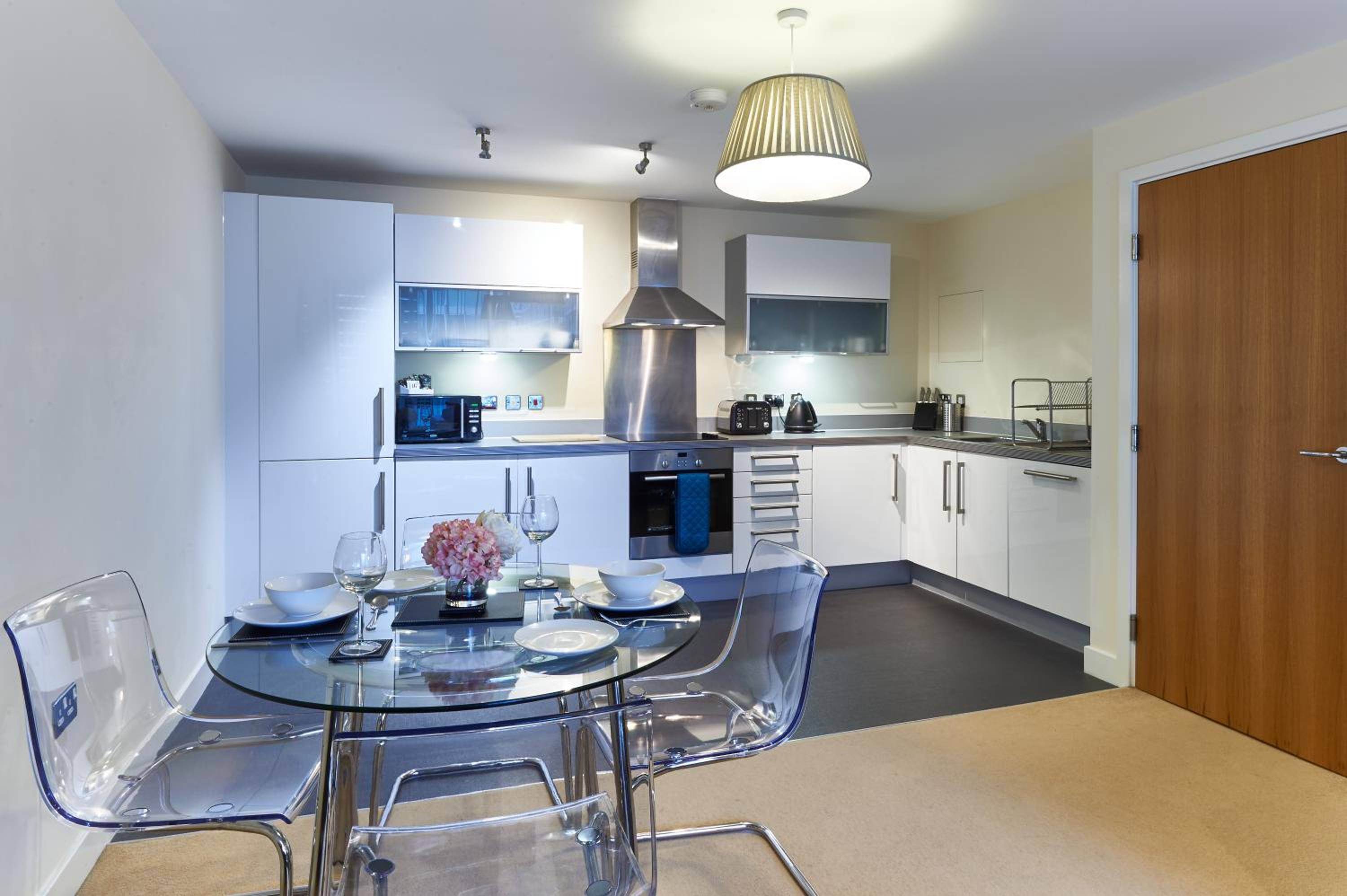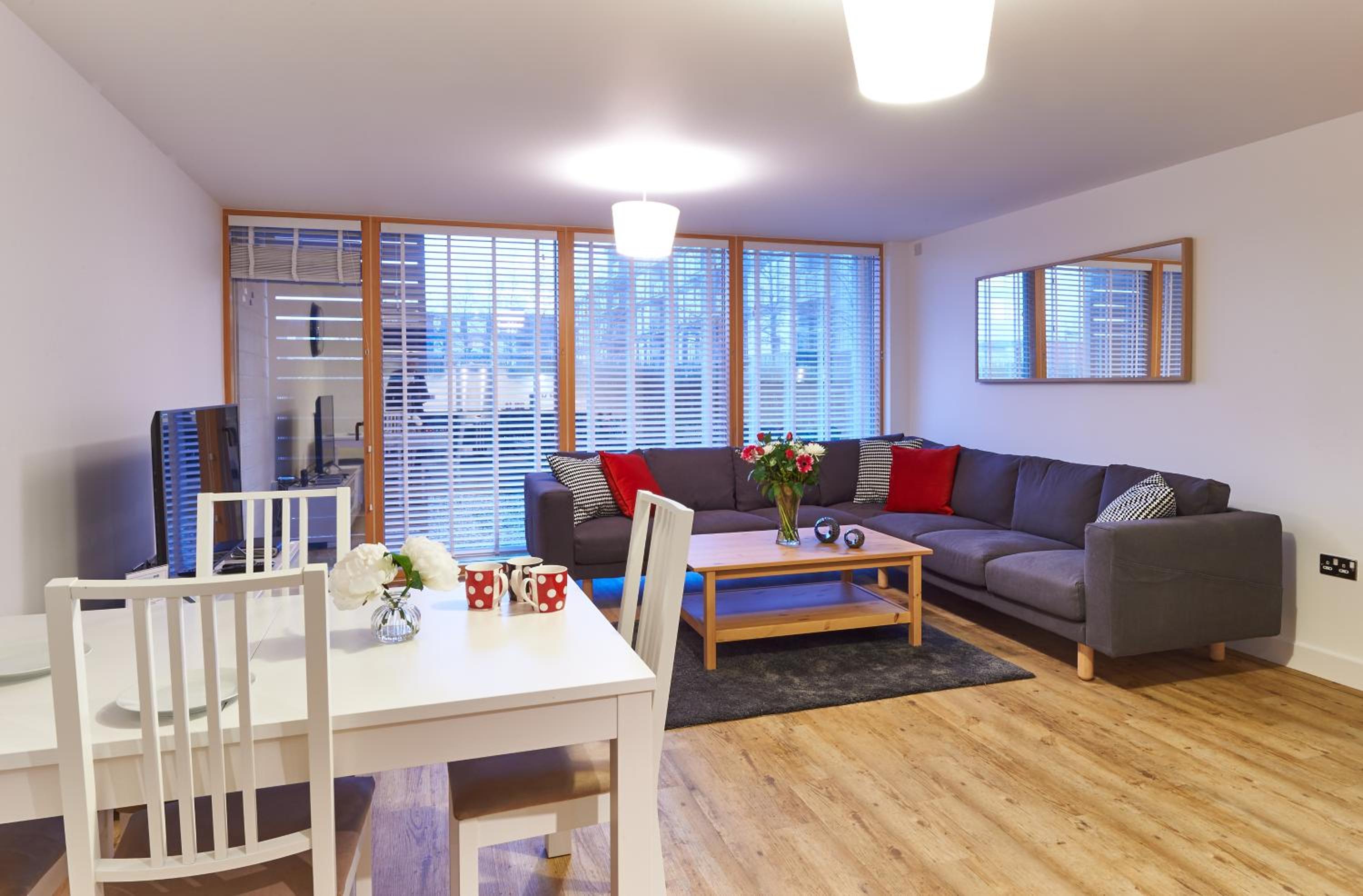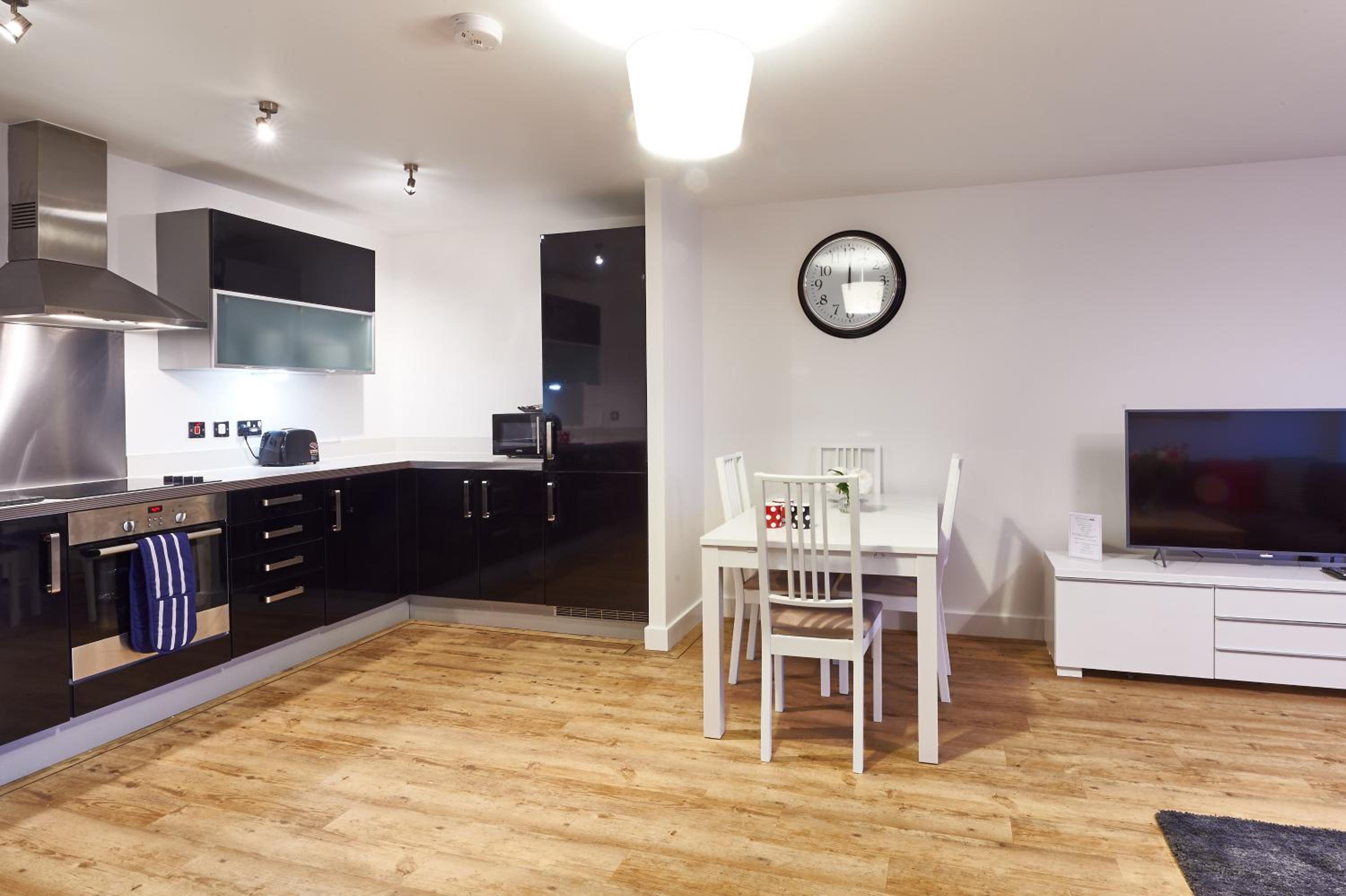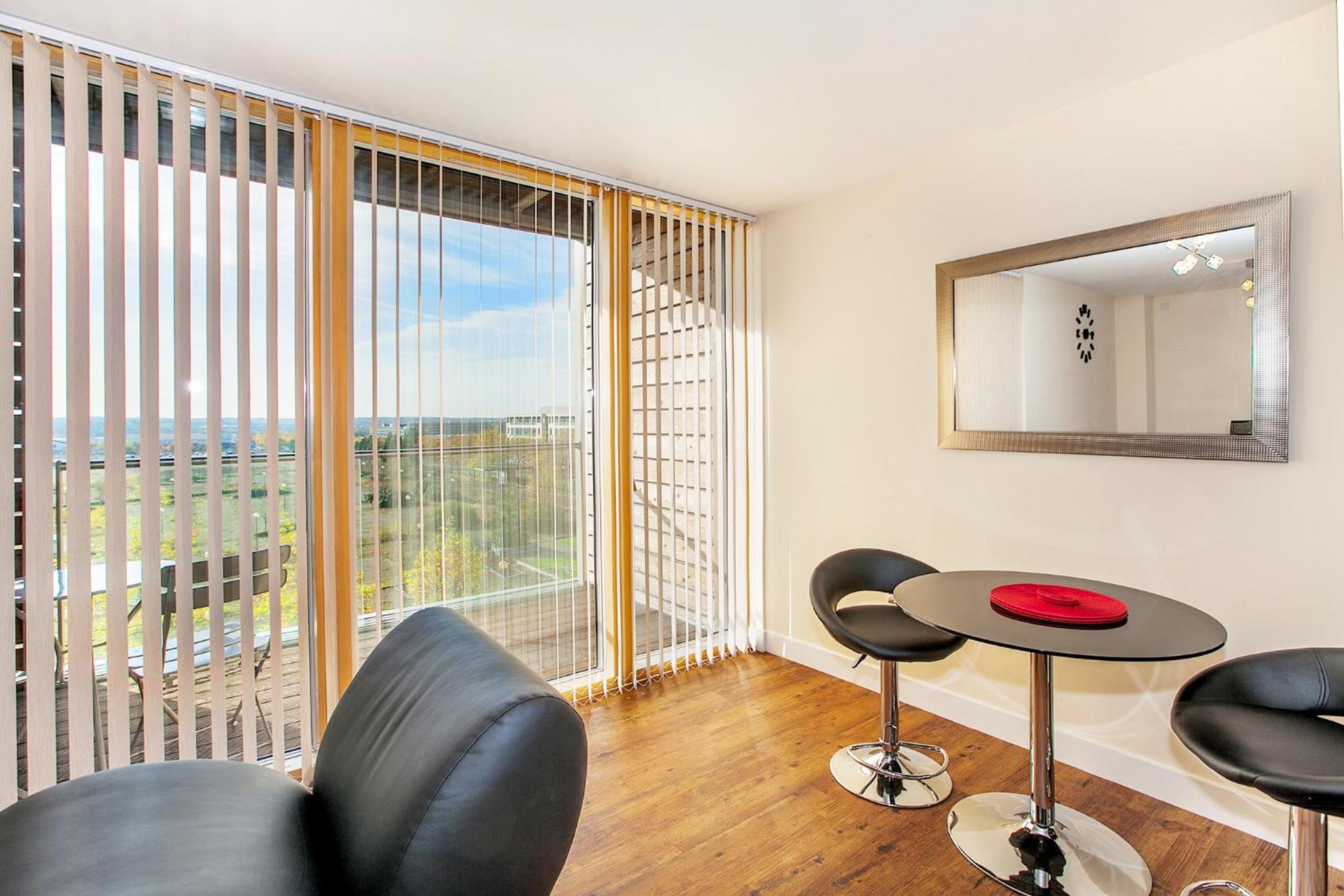 The Vizion is located in Milton Keynes, featuring a peaceful and refreshing rooftop water gardens and superb quality throughout. Each spacious 1, 2 and 3 bedroom apartment has been designed, decorated and furnished to chic designer standards. Guests can relax with a soothing drink on your own private balcony, and admire the view of the city or Vizion’s glorious sky-high water gardens. Vizion is located in just the right place for guests to benefit from everything that’s good about Milton Keynes. MK train station is within realistic walking distance (although buses and taxis are readily available) and a short walk in the other direction takes guests to the famous mile-long indoor shopping mall. The rooms are equipped with modern amenities such as cable/satellite tv, cots on request, hairdryer, television and Wi-Fi. If guests want to cook in, kitchens are equipped with full sized, top quality appliances and there is a huge Sainsbury’s superstore next door. At Vizion guests truly are spoilt for choice for dining out, and here they have what many consider to be MK’s finest dining-out choices of all - at The Hub, just across the road.