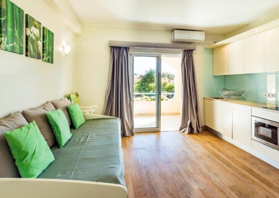 El Hotel Apartamento A Floresta do José ofrece apartamentos con aire acondicionado y balcón. Están decorados en tonos verdes y blancos.