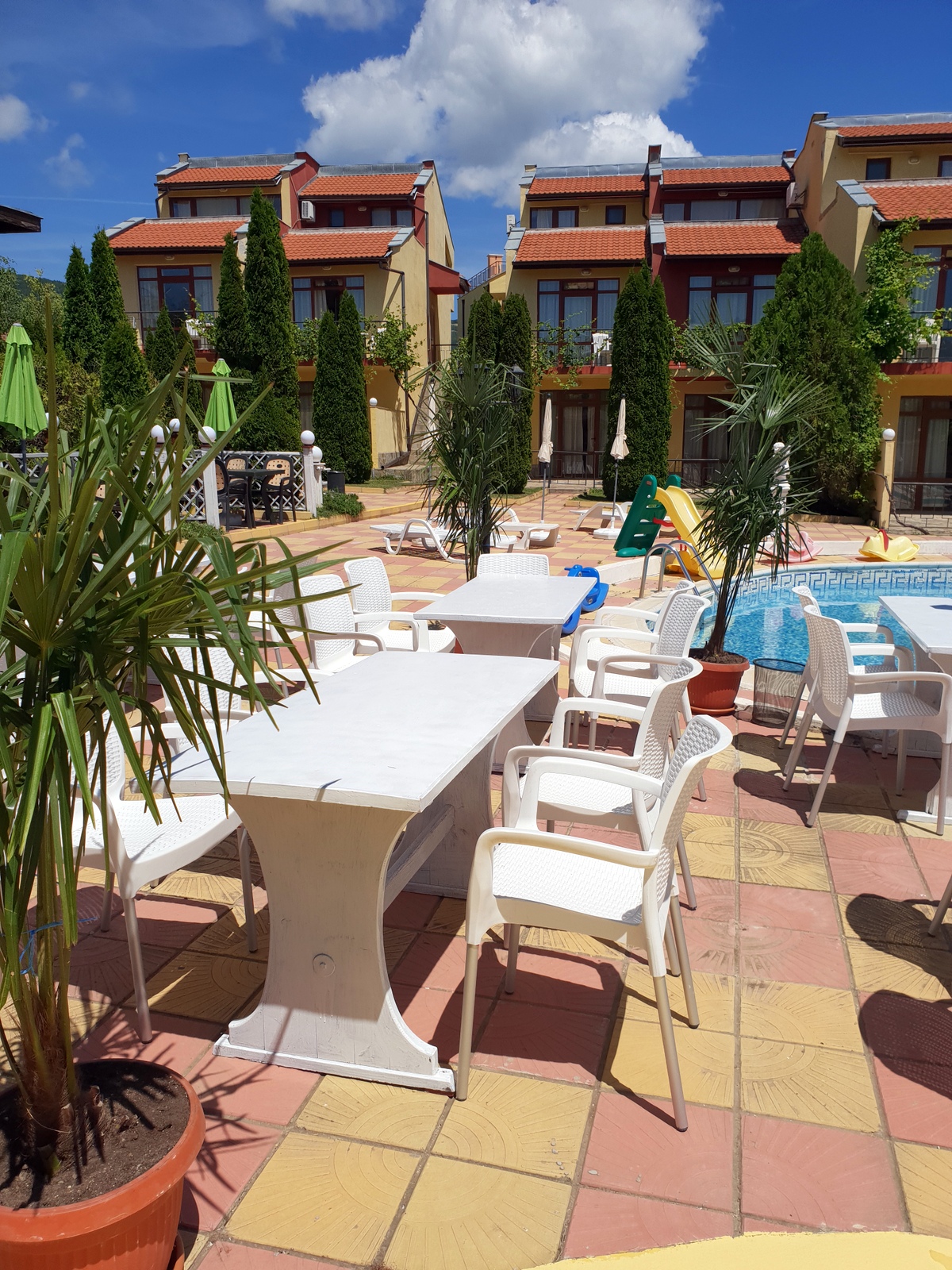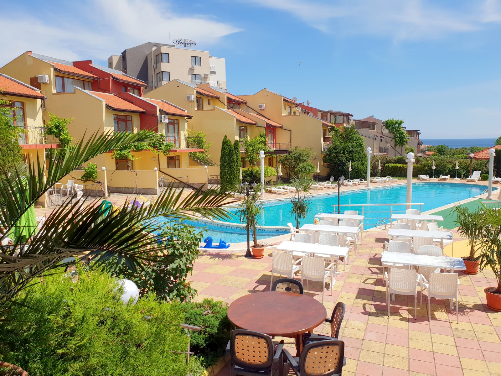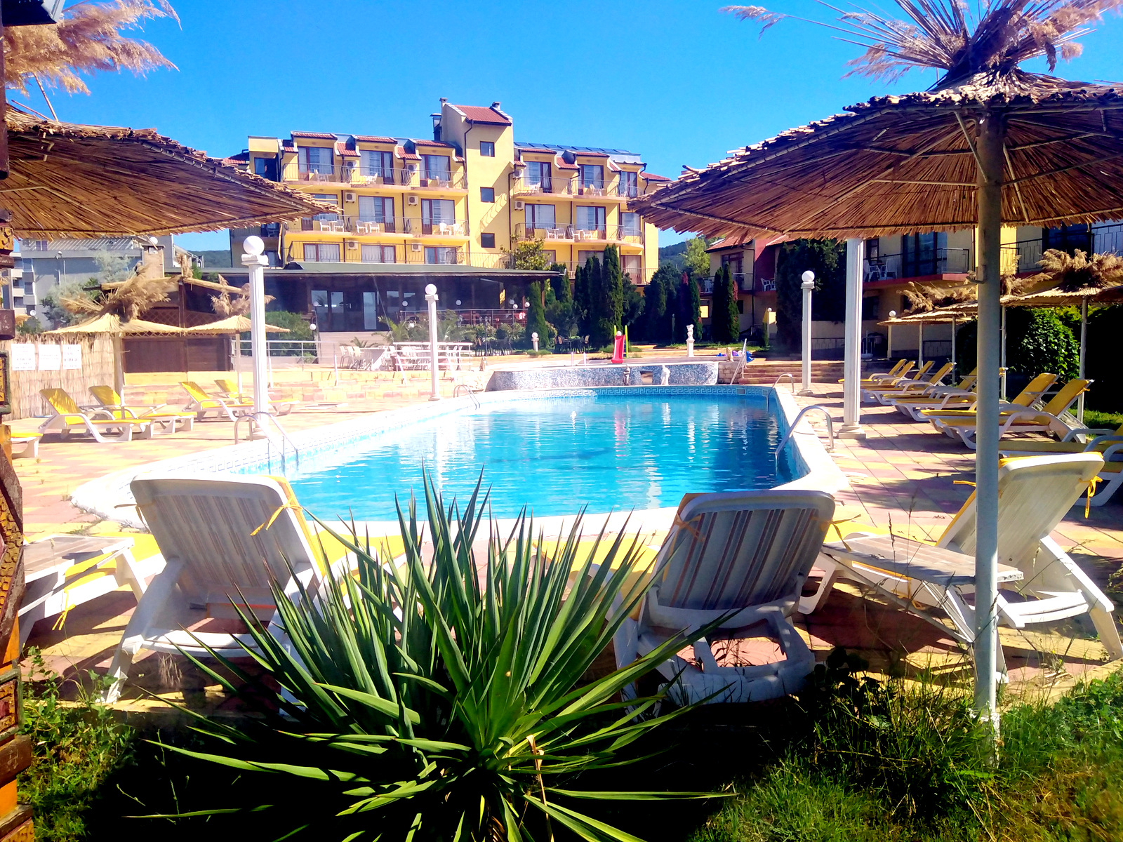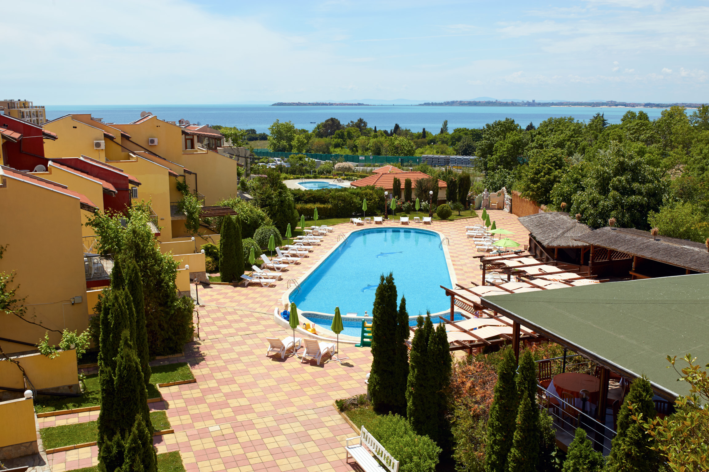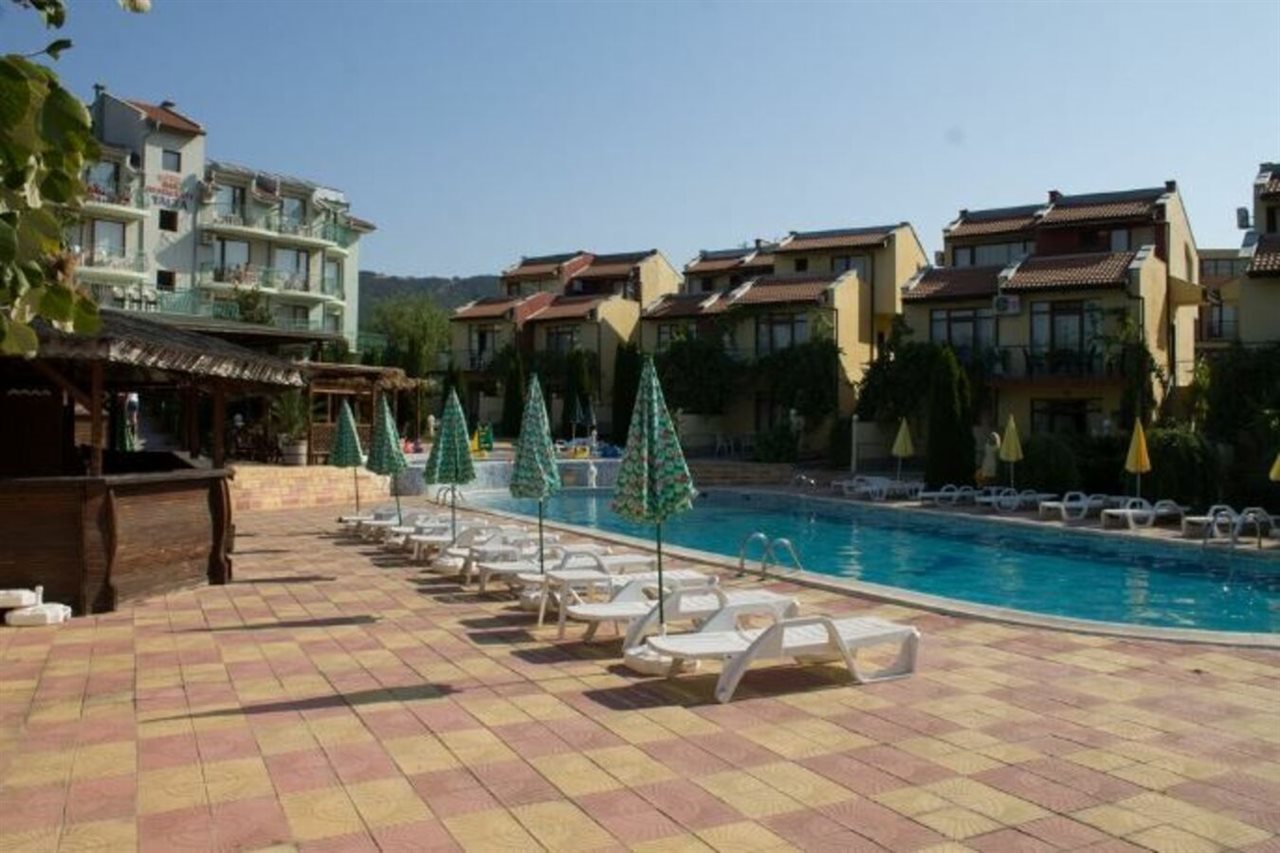 Este complejo de chalés de playa está situado en la carretera de Sveti Vlas, cerca andando de Sunny Beach (a unos 400 m). Hay aproximadamente 10 minutos de viaje al centro de la ciudad y se pueden encontrar paradas de transporte público a 200 m.||El complejo fue inaugurado en junio de 2006. El hotel comprende 3 plantas y ofrece 12 dormitorios dobles (camas extra disponibles) y 6 apartamentos de 1 dormitorio. La villa tiene también 10 espaciosos chalés de 3 plantas con vistas al jardín, así como 2 piscinas. Los huéspedes podrán admirar la espléndida vista del mar hasta el casco antiguo de Nesebar. El establecimiento es ideal para familias y dispone de servicio de salida y recepción 24 horas, servicio de cambio de divisas, prensa, un pequeño supermercado y aparcamiento. También hay cafetería, bar, y restaurante, así como servicio de habitaciones (de pago).||Cada alojamiento dispone de cuarto de baño privado con ducha, TV por cable, dormitorio, minibar, set de plancha, caja fuerte y una preciosa terraza/veranda con jardín y vistas del mar y del casco antiguo de Nesebar. Hay aire acondicionado regulable en todas las habitaciones.||Los huéspedes pueden alquilar tumbonas y sombrillas en la playa de arena. El hotel cuenta con 2 piscinas con zona infantil de baño y chiringuito, así como con bar, tumbonas y sombrillas. Los huéspedes también podrán relajarse jugando al billar/snooker.||El complejo cuenta con un restaurante que sirve platos búlgaros e internacionales para todos los gustos. Se sirve desayuno diario de bufet.