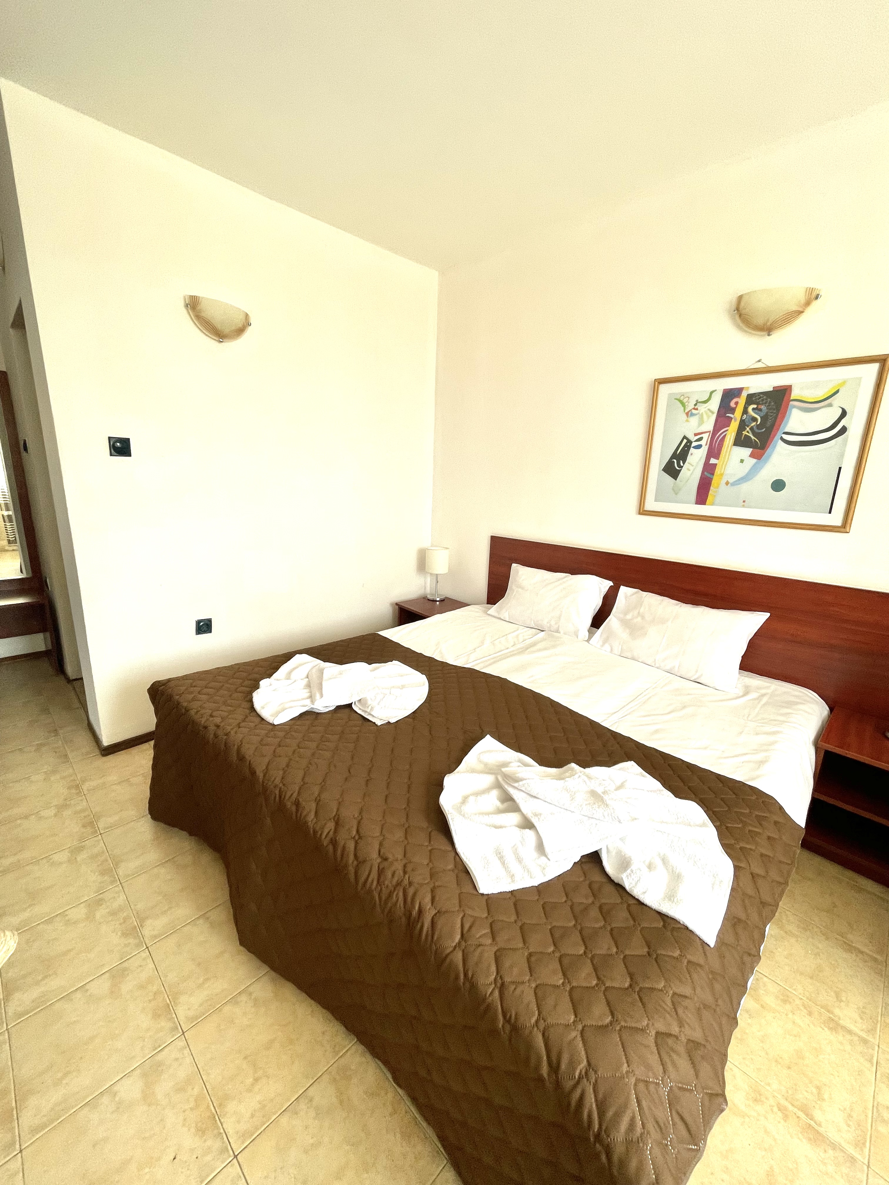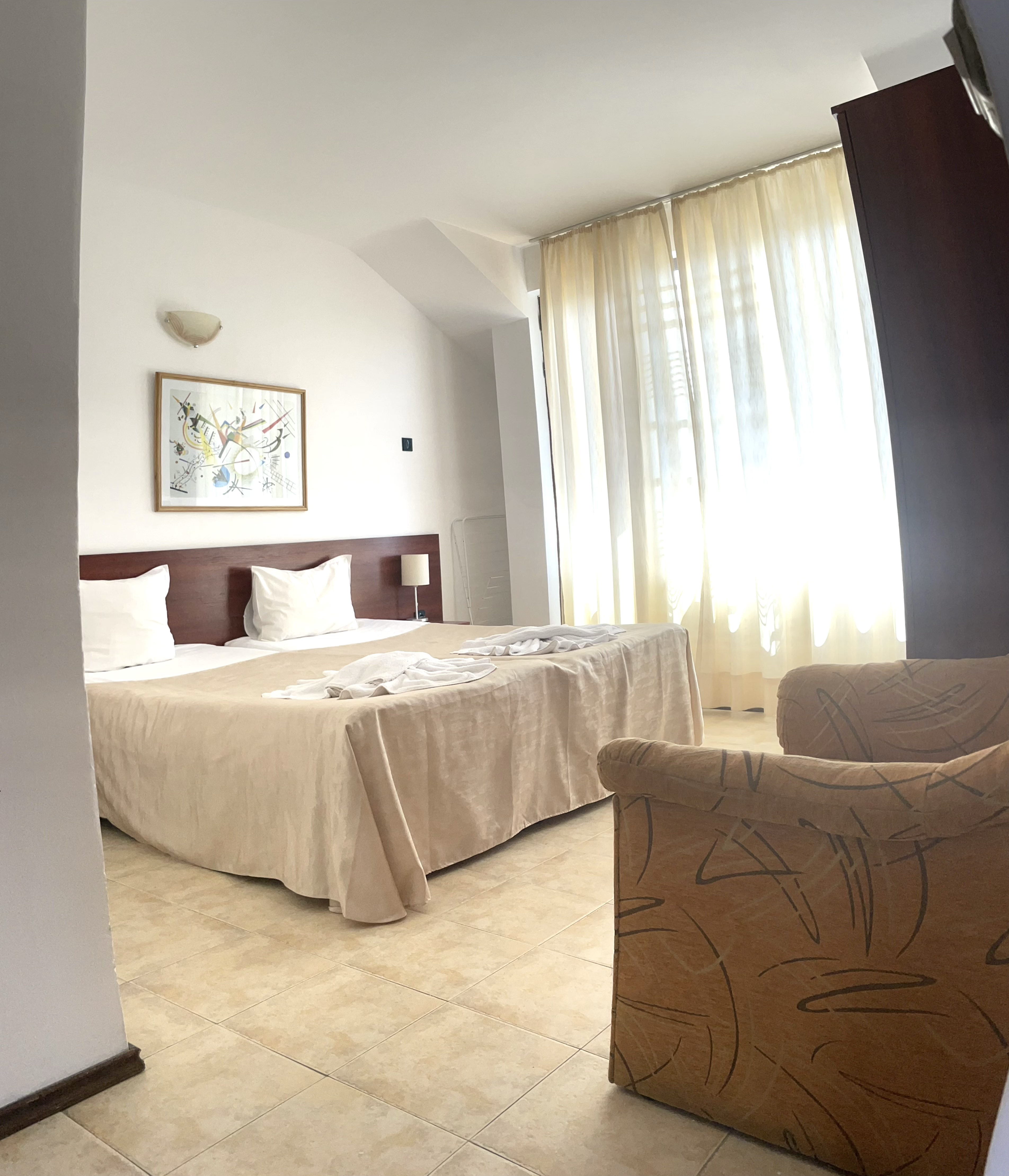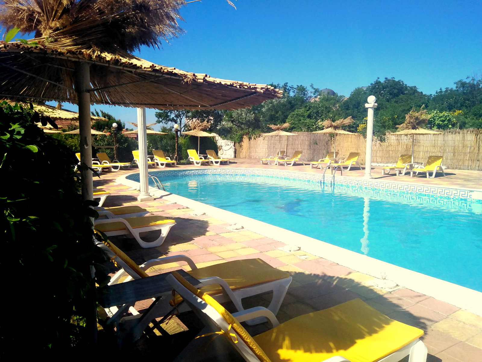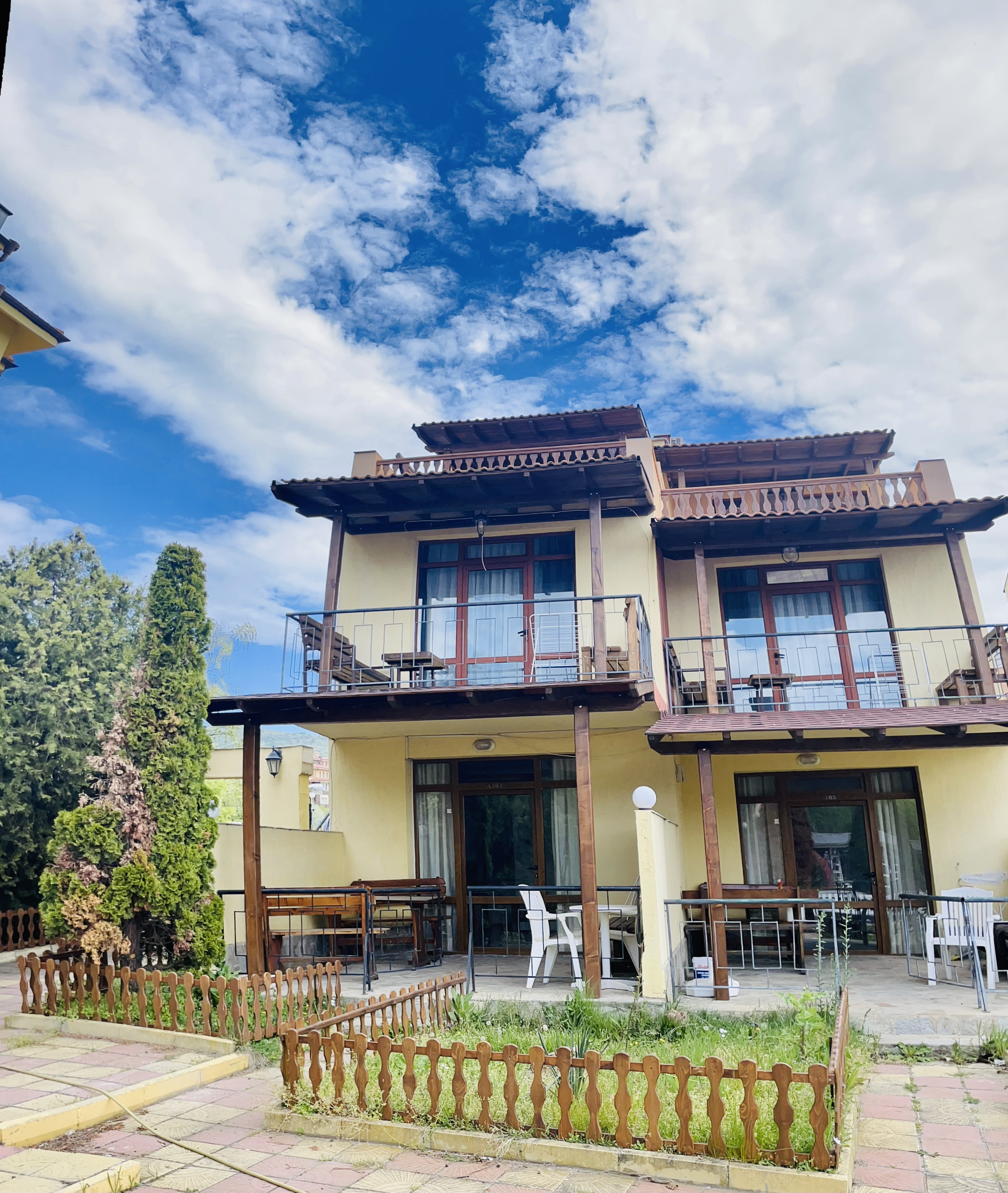 Este complejo de chalés de playa está situado en la carretera de Sveti Vlas, cerca andando de Sunny Beach (a unos 400 m). Hay aproximadamente 10 minutos de viaje al centro de la ciudad y se pueden encontrar paradas de transporte público a 200 m.||El complejo fue inaugurado en junio de 2006. El hotel comprende 3 plantas y ofrece 12 dormitorios dobles (camas extra disponibles) y 6 apartamentos de 1 dormitorio. La villa tiene también 10 espaciosos chalés de 3 plantas con vistas al jardín, así como 2 piscinas. Los huéspedes podrán admirar la espléndida vista del mar hasta el casco antiguo de Nesebar. El establecimiento es ideal para familias y dispone de servicio de salida y recepción 24 horas, servicio de cambio de divisas, prensa, un pequeño supermercado y aparcamiento. También hay cafetería, bar, y restaurante, así como servicio de habitaciones (de pago).||Cada alojamiento dispone de cuarto de baño privado con ducha, TV por cable, dormitorio, minibar, set de plancha, caja fuerte y una preciosa terraza/veranda con jardín y vistas del mar y del casco antiguo de Nesebar. Hay aire acondicionado regulable en todas las habitaciones.||Los huéspedes pueden alquilar tumbonas y sombrillas en la playa de arena. El hotel cuenta con 2 piscinas con zona infantil de baño y chiringuito, así como con bar, tumbonas y sombrillas. Los huéspedes también podrán relajarse jugando al billar/snooker.||El complejo cuenta con un restaurante que sirve platos búlgaros e internacionales para todos los gustos. Se sirve desayuno diario de bufet.